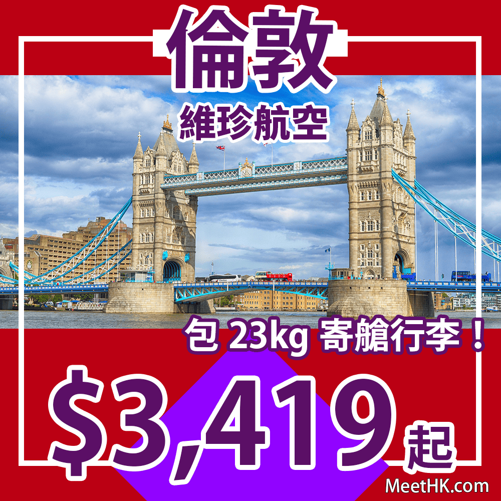 維珍直航倫敦再有優惠!連稅5千!包23kg寄艙行李!6月13日前出發!香港直飛往返倫敦只需$3,419起 – 維珍航空 (優惠至4月30日)