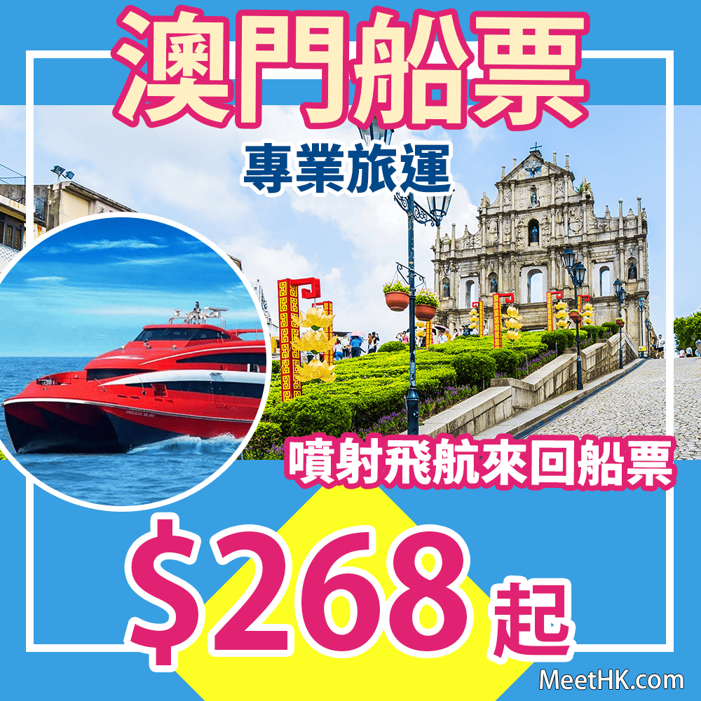 又有啦!澳門船飛優惠!訂飛去澳門大食特食!噴射飛航來回香港至澳門船票只需$268起!而家仲送澳門銀河逍遙賞餐飲換領券添呀!– 專業旅運 (優惠至5月7日)