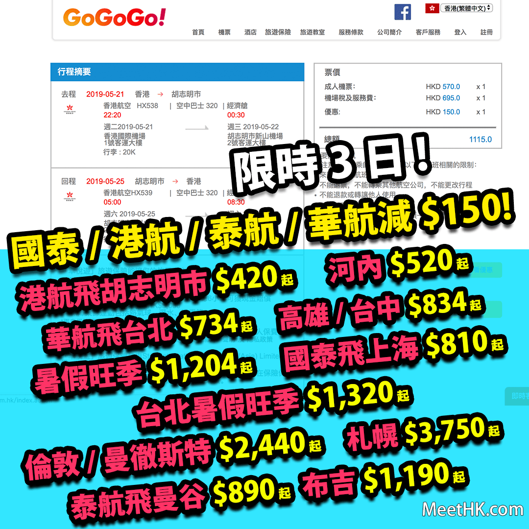 限時3日!名額200個!國泰/港航/泰航/華航每張機票減$150!華航飛台北$734起,高雄/台中$834起,暑假旺季$1,204起、泰航飛曼谷$890起,布吉$1,190起、國泰飛台北暑假旺季$1,320起,倫敦/曼徹斯特$2,440起,札幌$3,750起 – GoGoGo (優惠至5月6日)