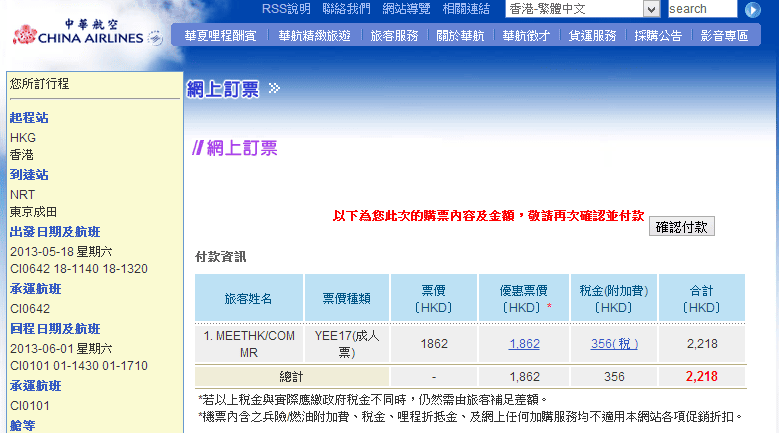 (如果打算中停台北,須補付相關稅金及燃油費差額,大家訂呢類機票最好打上華航訂位部2868-2299 check左機位先)