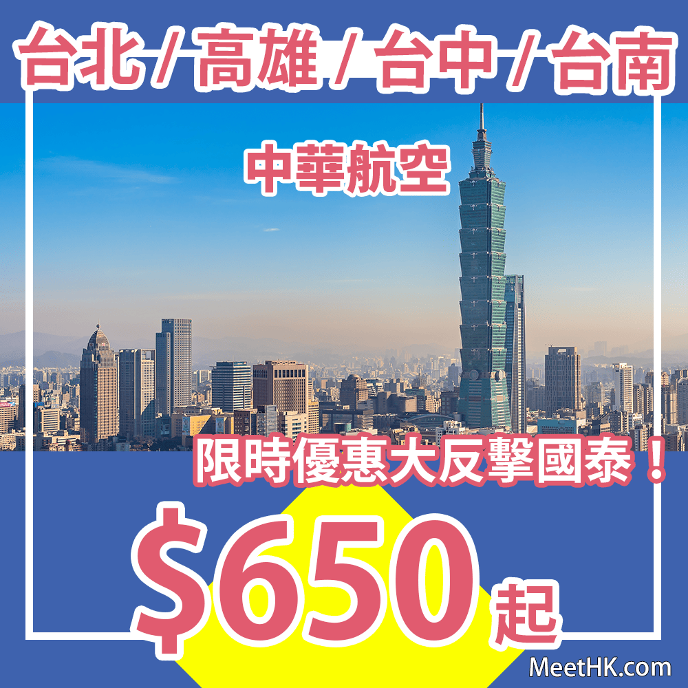 華航台灣限時激減!反擊國泰fanfares!連稅千三蚊!航班時間多!可早去晚返!可Open Jaw!香港往返台北/高雄/台中/台南$650起 – 中華航空 (優惠至5月8日)