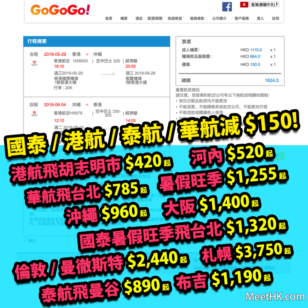 限時3日!名額200個!國泰/港航/泰航/華航每張機票減$150!華航飛台北$785起,暑假旺季$1,255起、港航飛沖繩$960起,大阪$1,400起、國泰暑假旺季飛台灣$1,320起,倫敦$2,440起,札幌$3,750起、泰航飛曼谷$890起 – GoGoGo (優惠至5月12日)