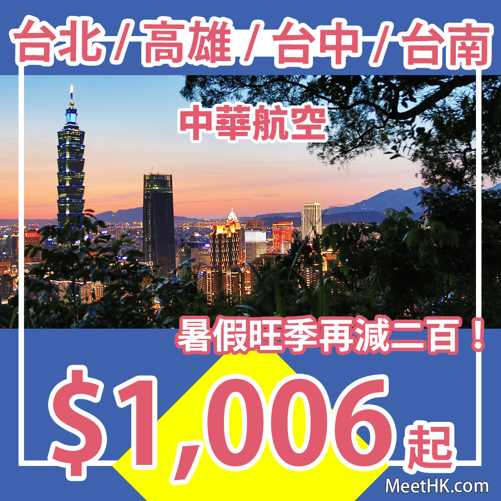 華航暑假旺季飛台北/高雄/台中/台南來回只需$1,006起