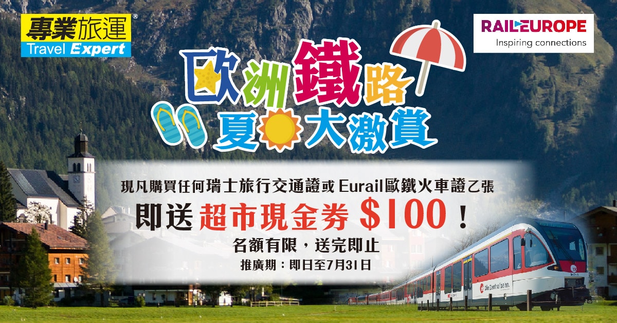 而家喺專業旅運預訂瑞士旅行交通證/Eurail歐鐵火車證仲送$100超市禮劵添!名額有限,先到先得!