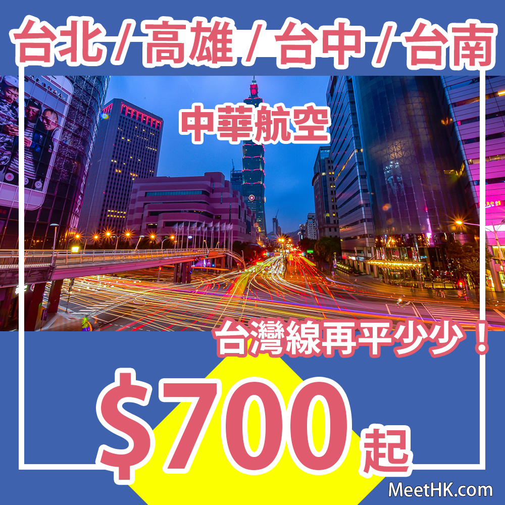 https://www.cheaptickets.hk (台北/高雄/台南/台中$700起,連稅高雄$1,329起,台北$1,315起,台南$1,360起,台中$1,404起,每單減$100折扣代碼:MEETHK2019,需透過此連結預訂)