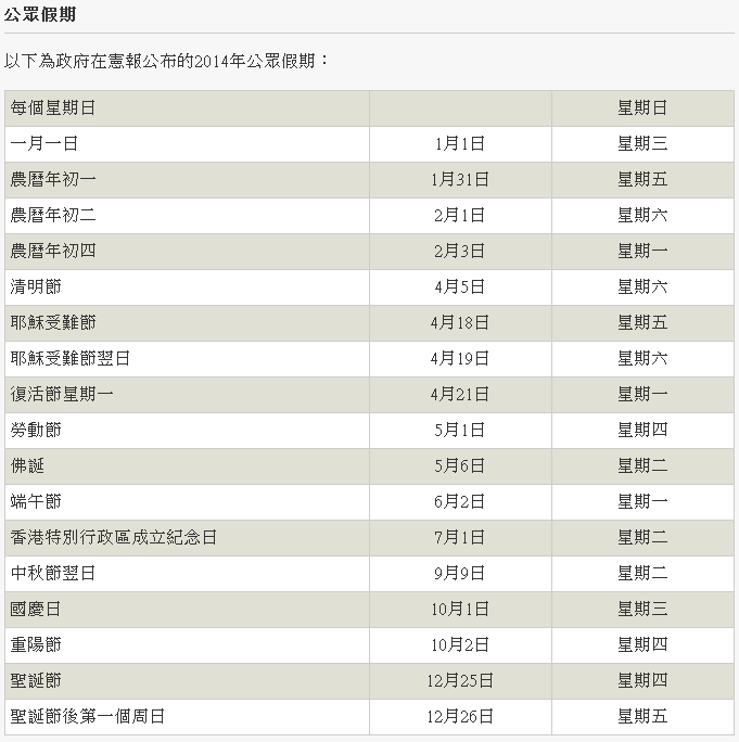 2014年香港公眾假期一覽 (General Holidays for 2014)