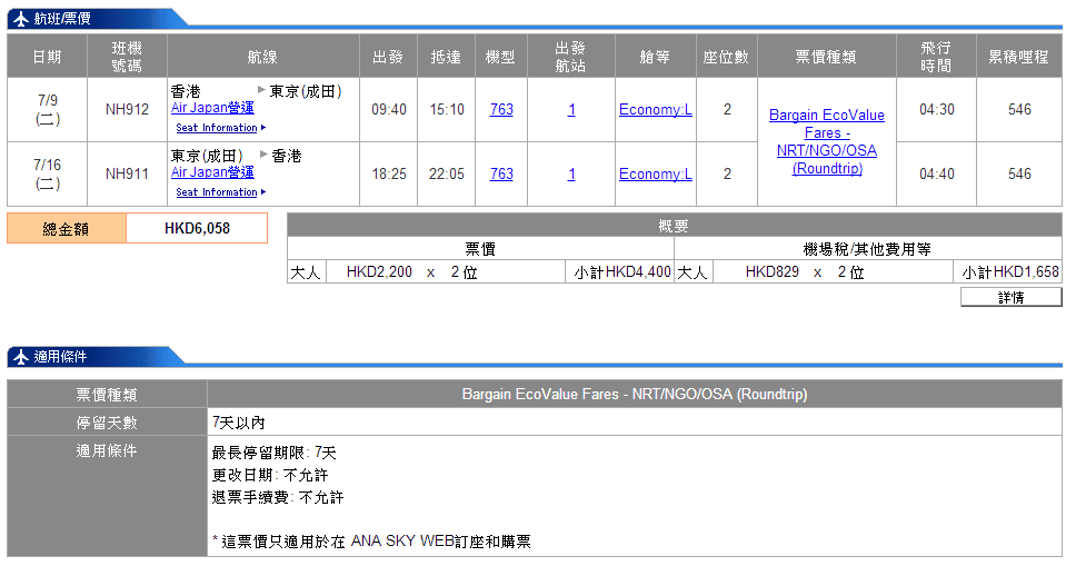 經我們測試,以東京7月9日出發,7月16日返回為例