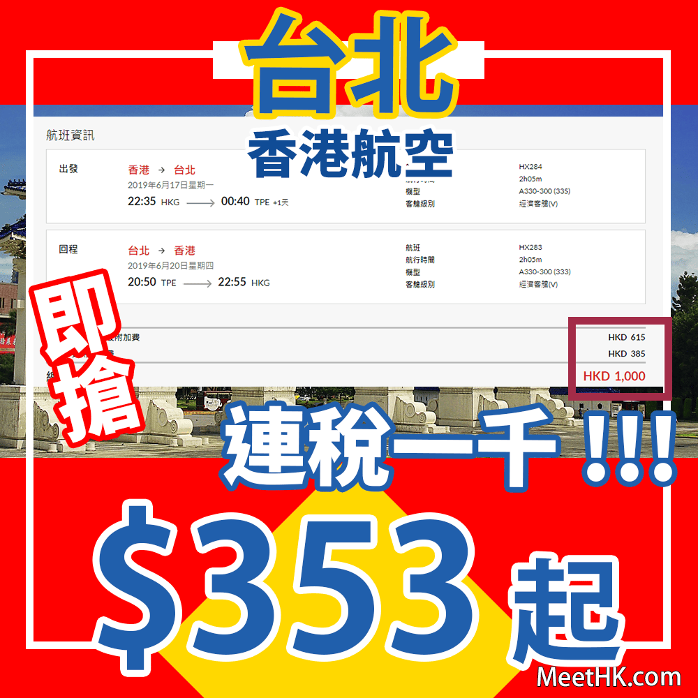 搶啊!有平啦!6月超平快閃!連稅一千!香港往返台北只需$353起,連稅$1,000起!!!!– 香港航空 (優惠至6月10日)