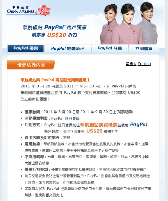 即日起至 2011 年 9 月 30 日,凡 PayPal 用戶於中華航空網站 購買機票並使用 PayPal 帳戶支付款項,即可享有HK$156 / US$20 的立即接扣優惠!