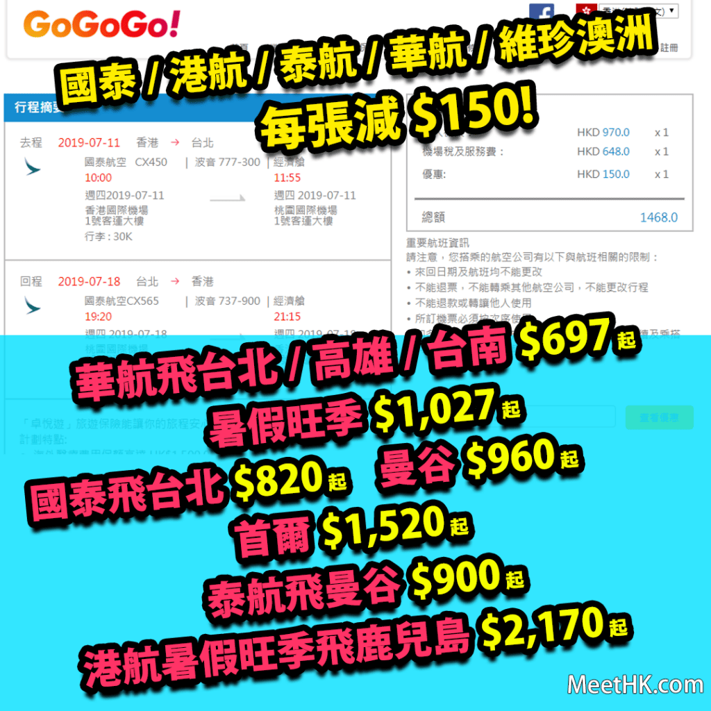 限時3日!國泰/港航/泰航/華航/維珍澳洲每張減$150!華航飛台灣$697起、暑假旺季$1,027起,國泰飛台北$820起、曼谷$960起、首爾$1,520起,泰航飛曼谷$900起、港航暑假旺季飛鹿兒島$2,170起 – GoGoGo (優惠至6月10日)