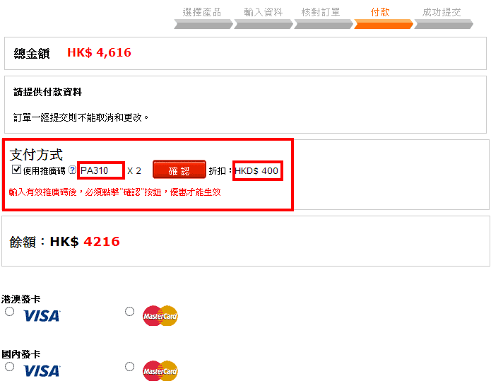 大家記住要係付款頁面輸入推廣碼 “PA310” 先可以每位即時減$200,(如下圖)