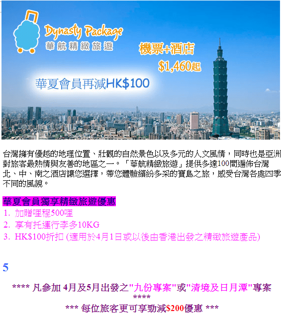另外華夏會員所減既$100唔會係價單到即時減的,大家要係下需求單時先輸入會員號碼,或者之後補返會員資料俾旅行社,旅行社先會係結帳時减返$100