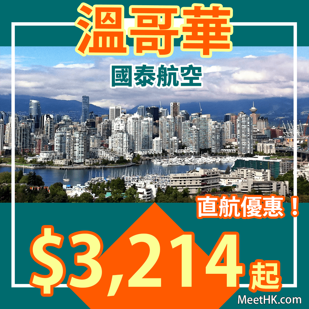 國泰直飛溫哥華優惠!連稅唔駛五千!秋冬出發!香港往返溫哥華只需$3,214起 – 國泰航空 (優惠至6月28日)
