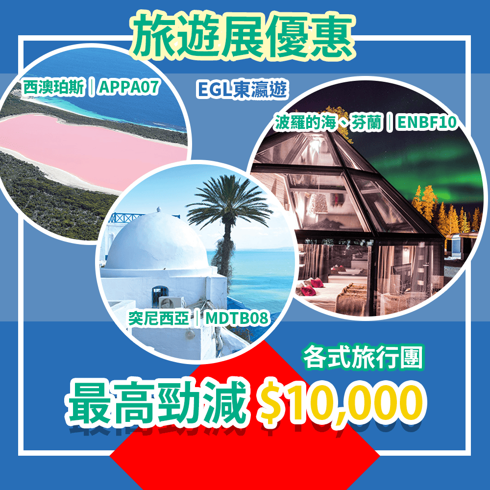 旅遊展優惠!最高勁減$10,000!突尼西亞8天團每位$5,399起、西澳珀斯 7天團每位$13,999起、波羅的海三國、芬蘭10天團每位$18,999起 – EGL東瀛遊