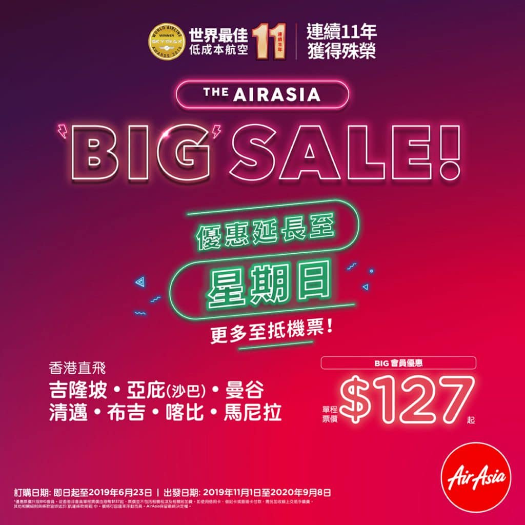 把握搶平飛機會!AirAsia Big Sale延長至23/6!全線激減!抵到無朋友!賣到2020年9月!香港飛喀比來回連稅$647起、沙巴(亞庇)$688起、吉隆坡$736起、清邁$852起、曼谷/布吉$912起 – AirAsia