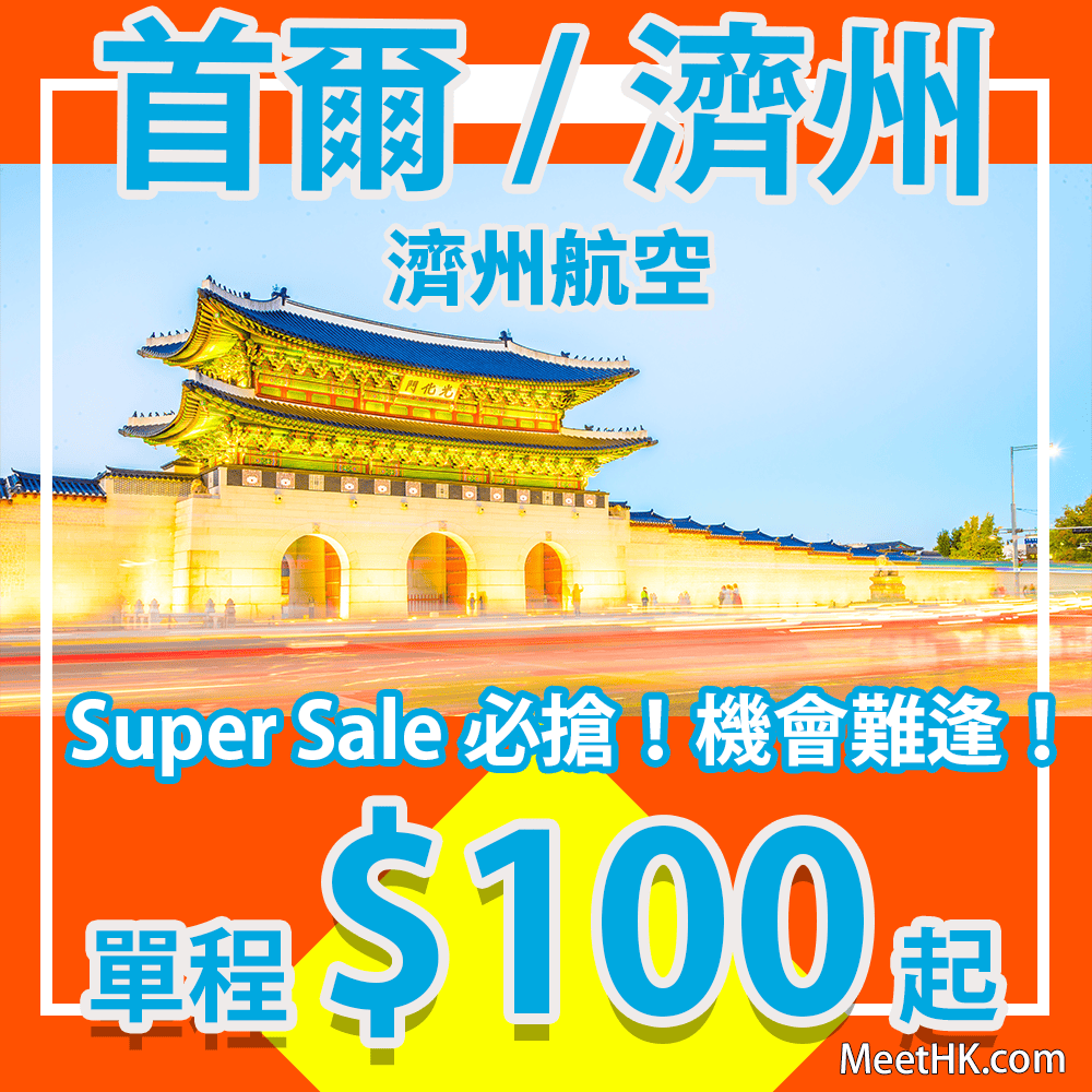 嘩!Super Sale!單程$100咋!連稅九百飛首爾!機會難逢!香港飛首爾/濟州單程只需$100起,澳門飛首爾MOP100起 – 濟州航空 (優惠至7月2日)