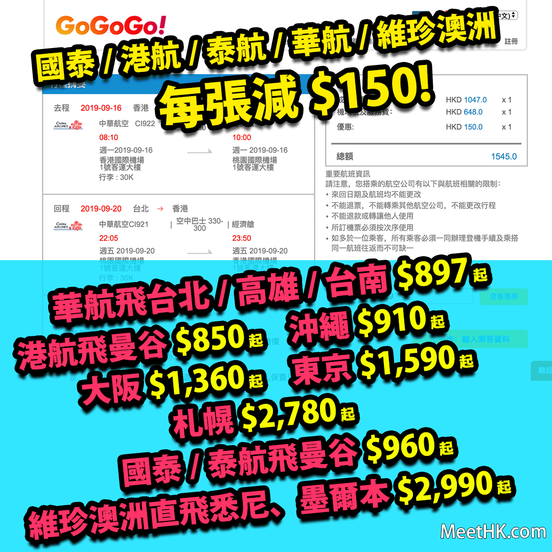 限時3日!國泰/港航/泰航/華航/維珍澳洲每張減$150!華航飛台灣$897起,港航飛曼谷$850起、沖繩$910起、大阪$1,360起、東京$1,590起、札幌$2,780起,國泰飛曼谷$960起,泰航飛曼谷$960起,維珍澳洲直飛悉尼、墨爾本$2,990起 – GoGoGo (優惠至6月30日)