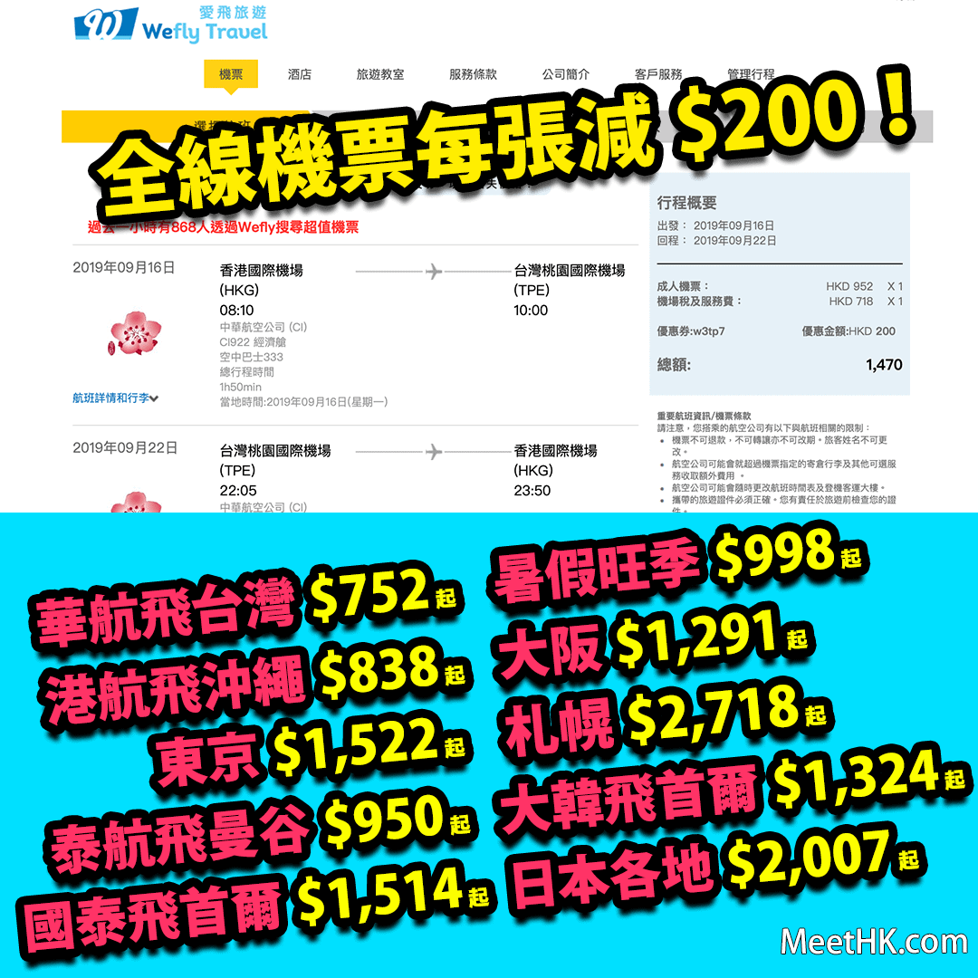 全線機票每張減$200! 華航飛台灣$752起、暑假$998起,泰航飛曼谷$950起,港航飛沖繩$838起、大阪$1,291起、東京$1,522起、札幌$2,718起,國泰飛首爾$1,514起、日本$2,007起,JAL飛東京$2,462起 – Wefly.com.hk (優惠至7月5日)