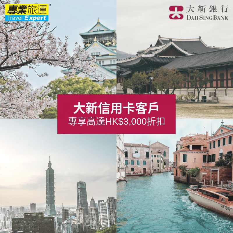 憑大新信用卡喺「專業旅運」同「尊賞假期」門市預訂精選旅行團/自由行套票即享最高HK$3,000折扣!
