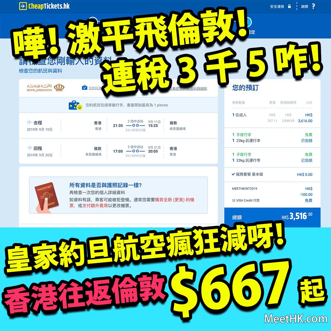 嘩嘩嘩!平飛倫敦話咁易!皇家約旦航空瘋狂減呀!連稅3千5!極少有!香港往返倫敦只需$667起 – 皇家約旦航空 (優惠至7月15日)