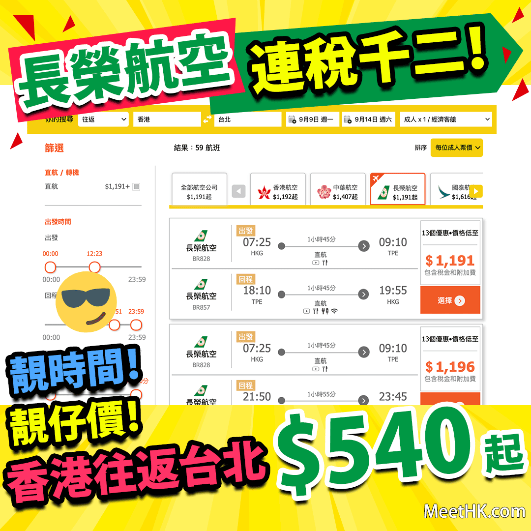 ($540起,連稅$1,191起,限星期日至三出發):去程限BR828 07:25-09:10、BR858 21:10-22:55、BR810 21:45-23:30,其他航班加$65起,回程無航班時間限制,睇返供應而定