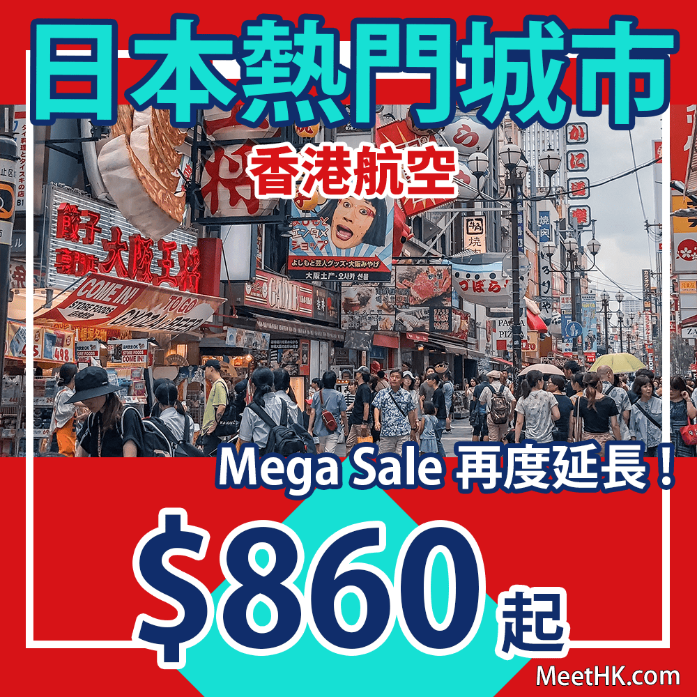 港航Mega Sale再度延長!日本熱門航點都有優惠!沖繩連稅千五!大阪連稅二千一!札幌連稅三千四!香港往返沖繩$860起、大阪$1,310起、東京$1,565起、札幌$2,730起 – 香港航空 (優惠至7月26日)