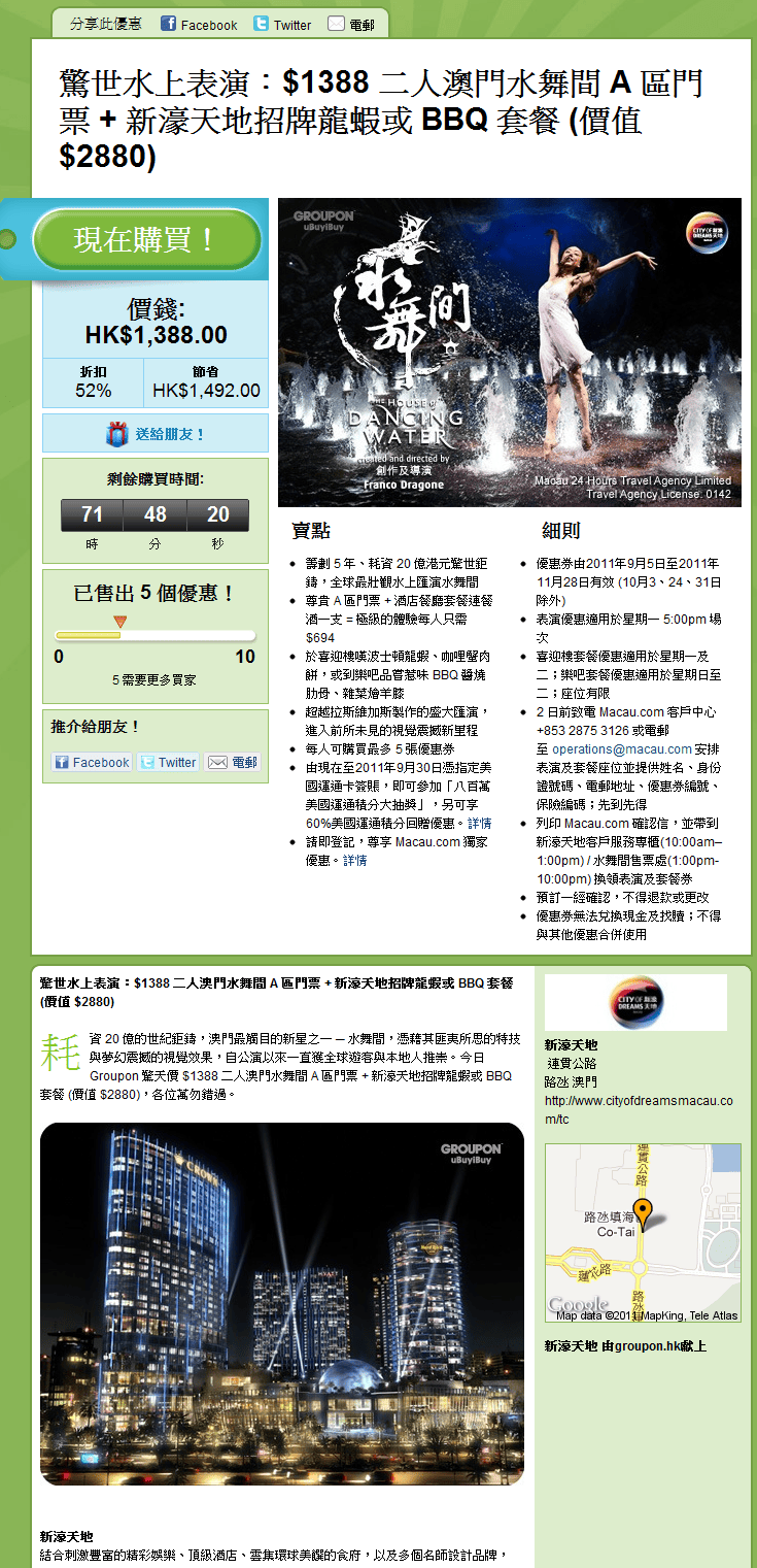 Groupon 澳門分站正式開站,團購第一擊率先為大家帶來「水舞間」。