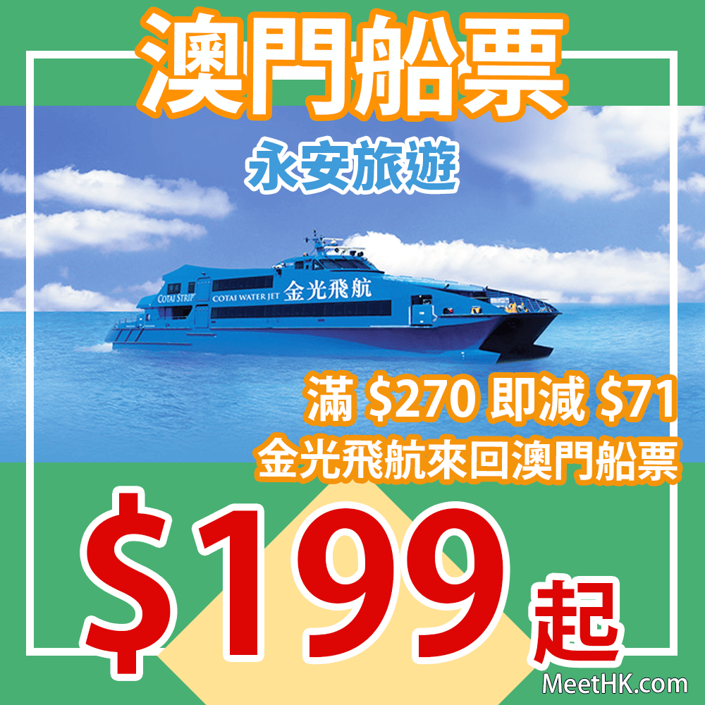 永安旅遊會係聽日(7月17日)下午1點推出限時3小時澳門來回船票每滿$270即減$71優惠