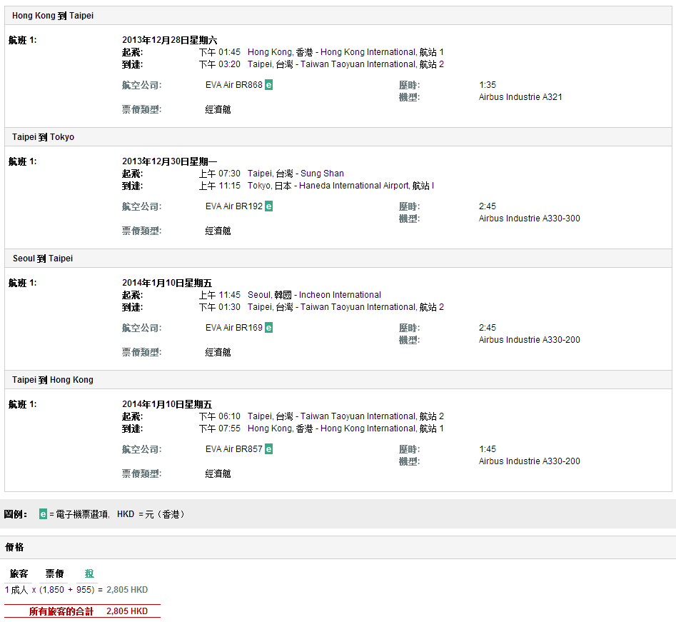 例如第一程12月28日香港飛台北,玩幾日12月30日台北飛東京,1月10日首爾返香港(經台北轉機)