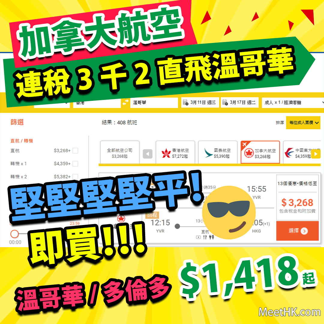 香港直飛溫哥華只需$1,418起,連稅$3,268起、多倫多$2,008起,連稅$3,902起