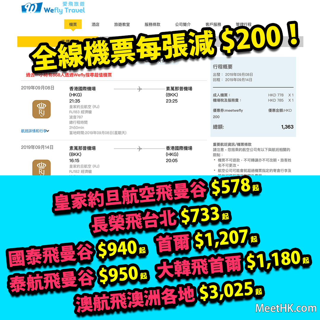 全線機票每張減$200!皇家約旦航空飛曼谷$578起,國泰飛曼谷$940起、首爾$1,207起,泰航飛曼谷$950起,大韓飛首爾$1,180起,澳航飛澳洲$3,025起 – Wefly.com.hk (優惠至8月18日)