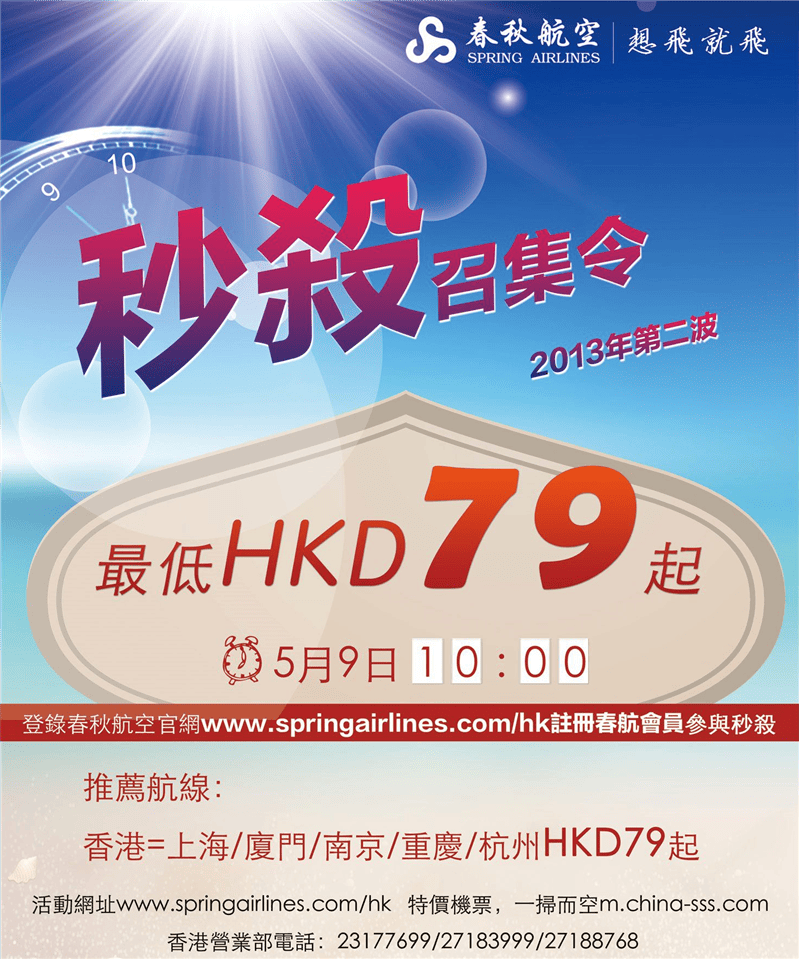 早上10時開搶!秒殺優惠!香港往返上海、杭州、南京、重慶、廈門單程只需$79起 – 春秋航空