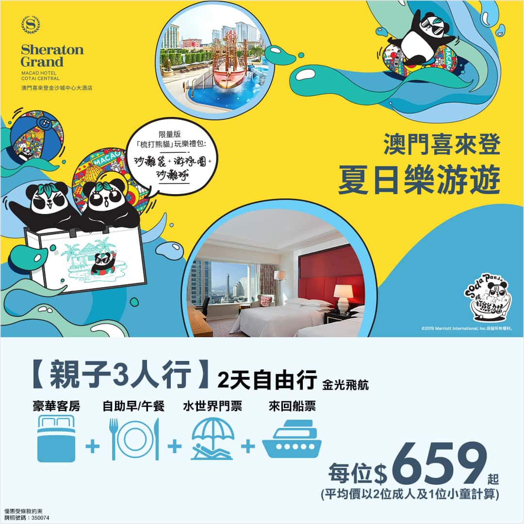 親子三人行!澳門套票優惠!包早/午餐+水世界門票!澳門喜來登金沙城中心大酒店2天住宿套票(酒店連船飛)2大1小每人只需$659起 – 永安旅遊