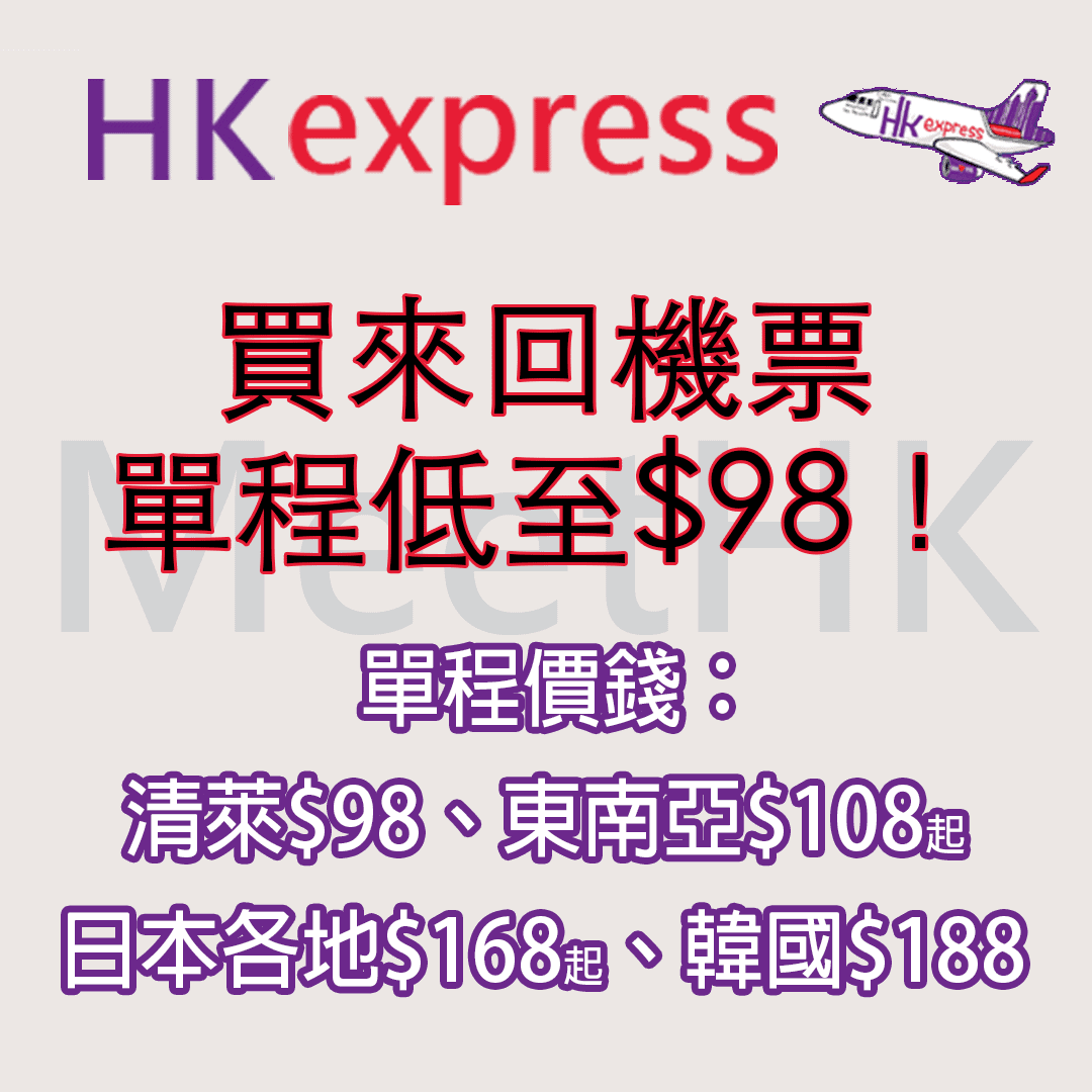 HK Express會係朝早9點推出買來回機票單程低至$98優惠!