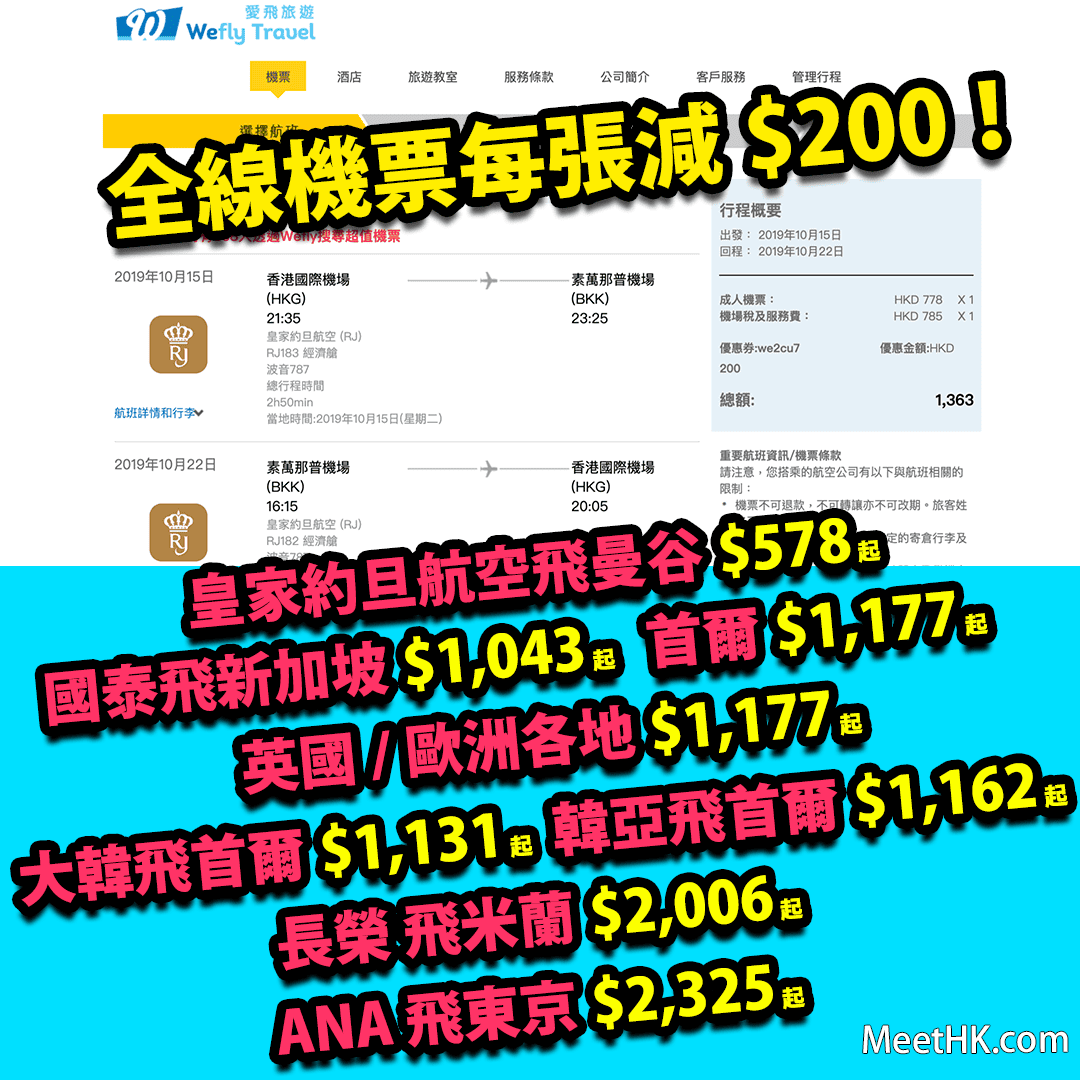 全線機票每張減$200!皇家約旦航空飛曼谷$578起,國泰飛新加坡$1,043起、首爾$1,177起,英國/歐洲各地$2,888起、大韓飛首爾$1,131起,長榮飛米蘭$2,006起、ANA飛東京$2,325起 – Wefly.com.hk (優惠至8月28日)