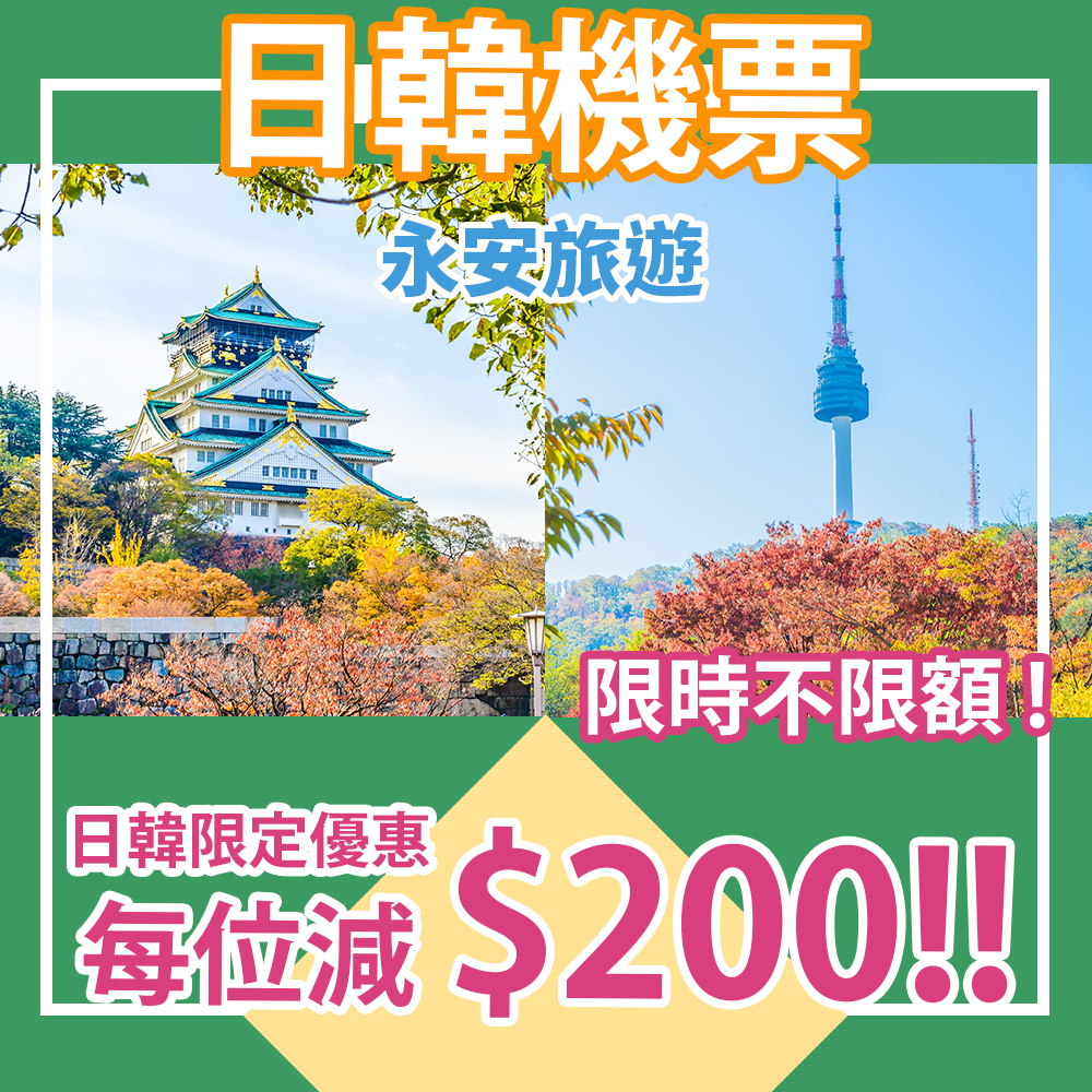 日韓限定優惠!每張激減$200!港航飛日本$680起,韓亞飛首爾$950起,大韓飛首爾$970起,國泰飛首爾$1,100起、日本$1,900起,ANA飛東京$2,230起,JAL飛東京$2,340起 – 永安旅遊 (優惠至8月28日4pm)