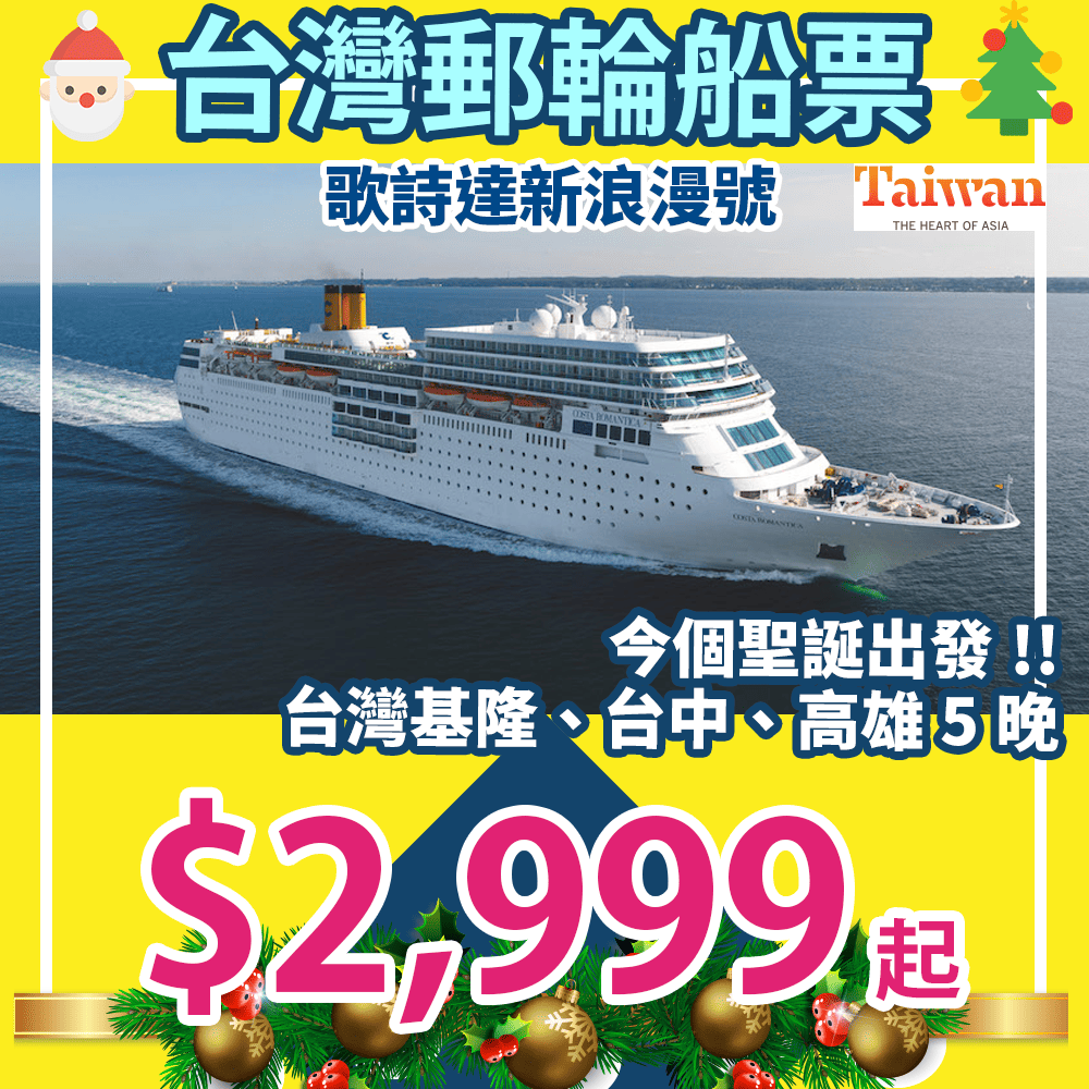 正!聖誕玩轉台灣!仲有聖誕禮物收!歌詩達新浪漫號台灣基隆、台中、高雄5晚船票每人只需$2,999起 – 專業旅運 Travel Expert (優惠至9月15日)