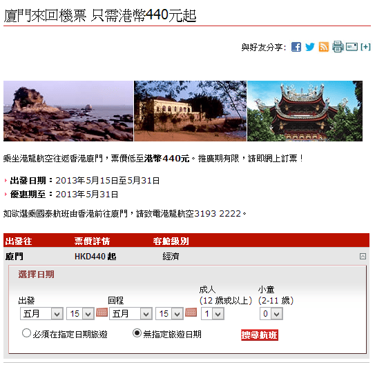 5月31日前出發!香港往返廈門只需$440 – 港龍航空 (優惠至5月31日)