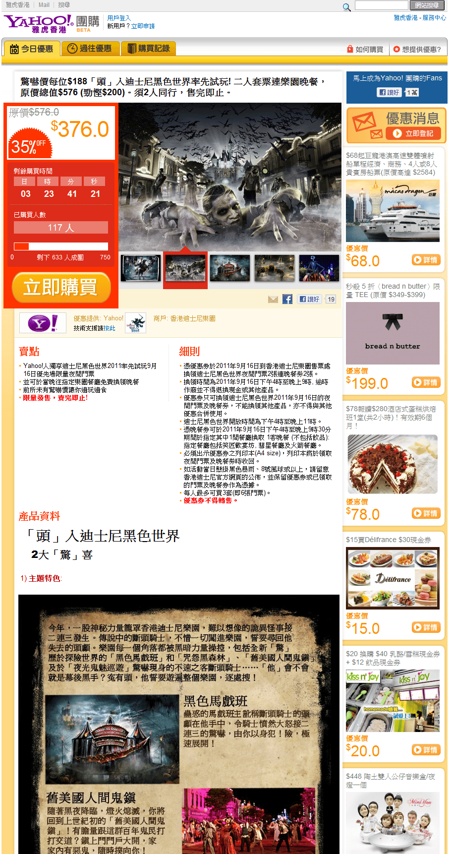 Yahoo! 團購推出了迪士尼黑色世界二人套票連樂園晚餐,驚嚇價每位$188