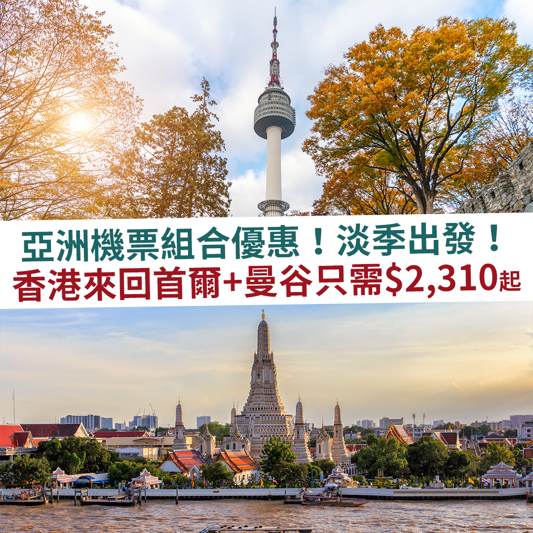 抵玩機票組合:香港往返首爾+曼谷只需$2,310起,連稅$3,742起
