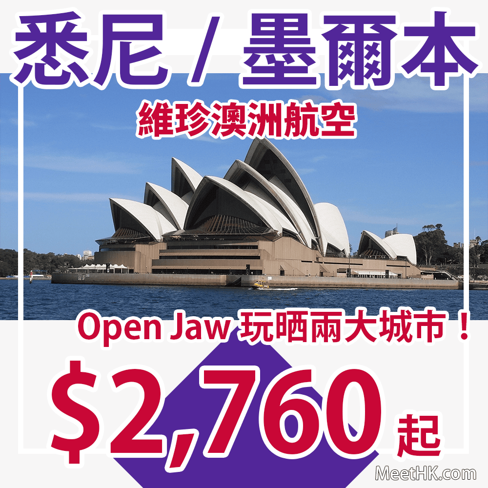 維珍澳洲推出澳洲優惠!直航連稅3千6起!可Open Jaw玩晒兩大城市!香港直航往返悉尼、墨爾本只需$2,760起 – 維珍澳洲航空 (優惠至9月30日)