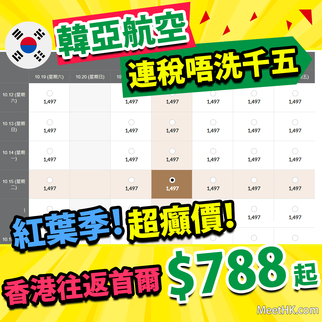 嘩嘩嘩!開搶啦!韓亞官網限時爆減!紅葉季照減呀!連稅唔洗千五飛首爾!可凌晨機去晩機返!香港往返首爾只需$788起 – 韓亞航空