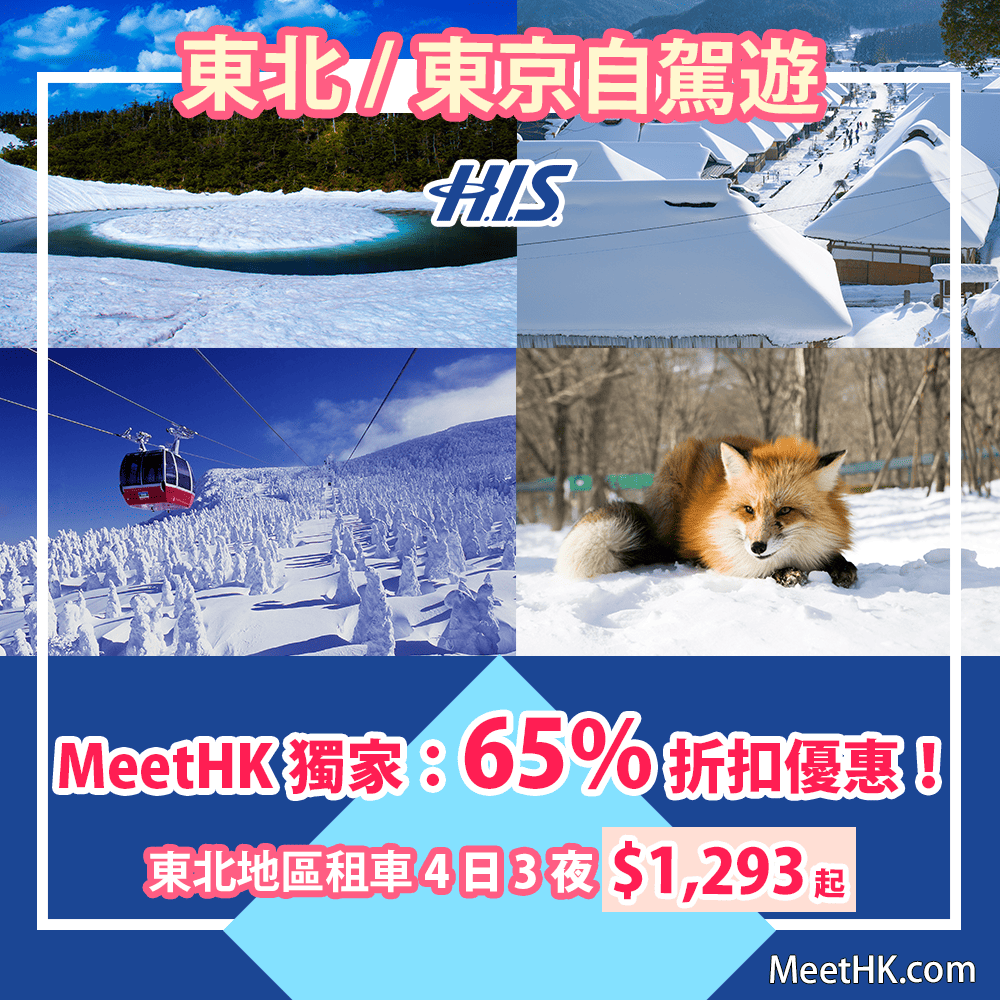租車自駕遊!遊走日本東北地區/東京!仲有MeetHK獨家優惠!東北地區/東京租車65% off優惠!東北地區租車4日3夜低至$1,293起 – H.I.S. 香港