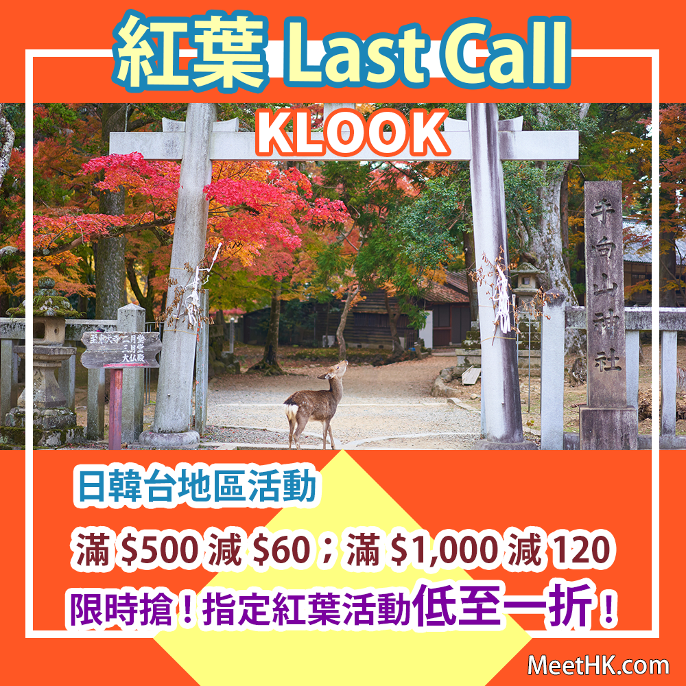 KLOOK推出紅葉 Last Call 優惠!日韓台地區活動滿$500減$60!滿$1,000減120!