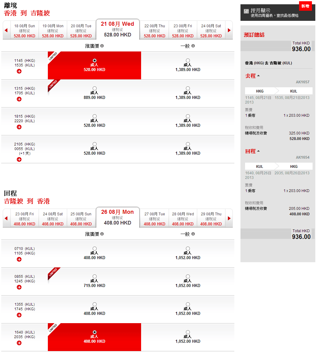 經我們測試,以吉隆坡8月21日出發,8月26日返回為例