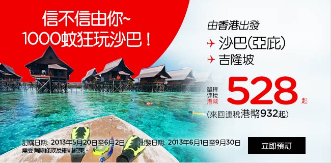6月至9月出發,香港往返吉隆坡、沙巴來回連稅只需$932