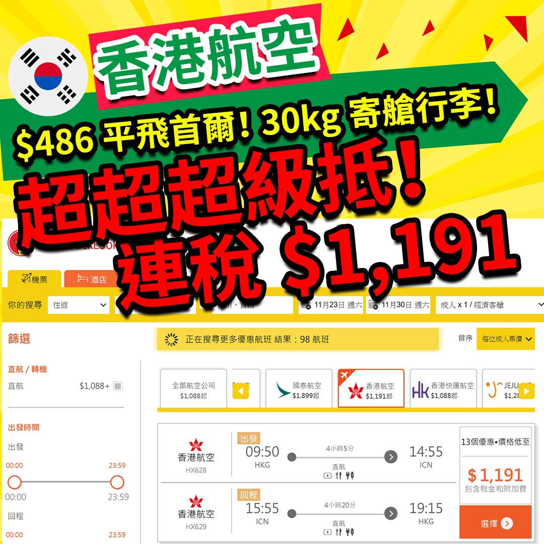 嘩!超超超級抵!連稅$1,191平飛首爾!可早去晚返!30kg寄艙行李!香港往返首爾只需$486起 – 香港航空