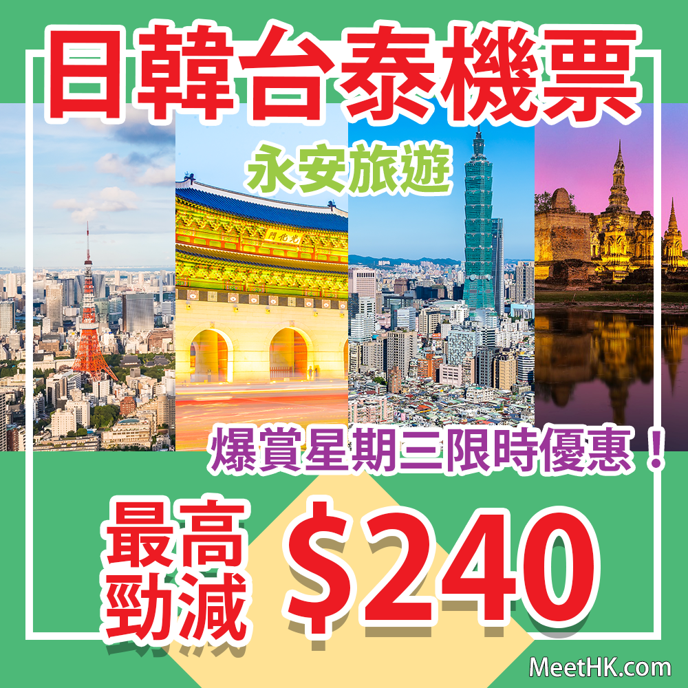 日韓台泰全線機票!最高勁減$240!韓亞飛首爾$1,030起,長榮飛台北$650起,港航飛曼谷$680起、東京$880起 – 永安旅遊 (優惠至10月9日4pm)