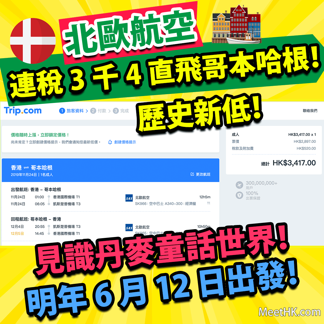 香港直飛哥本哈根來回只需$2,897起,連稅$3,417起,真係減到好盡!