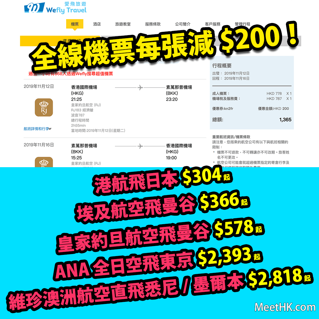 全線機票每張減$200!港航飛日本$304起,埃及航空飛曼谷$366起,皇家約旦航空飛曼谷$578起,ANA 全日空飛東京$2,393起,維珍澳洲直飛悉尼/墨爾本$2,818起 – Wefly.com.hk (優惠至10月23日)